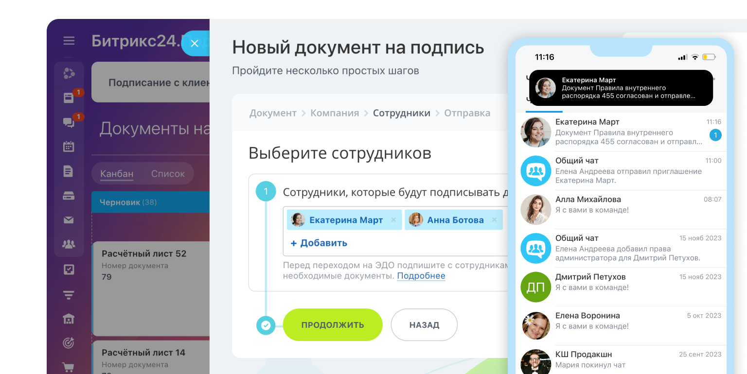 Для подписания кадровых документов больше не нужно идти в офис, отправлять курьера или оплачивать электронные ключи. Теперь поставить подпись можно онлайн в Битрикс24. И там же работать с задачами и чатиться — всё внутри одного сервиса.