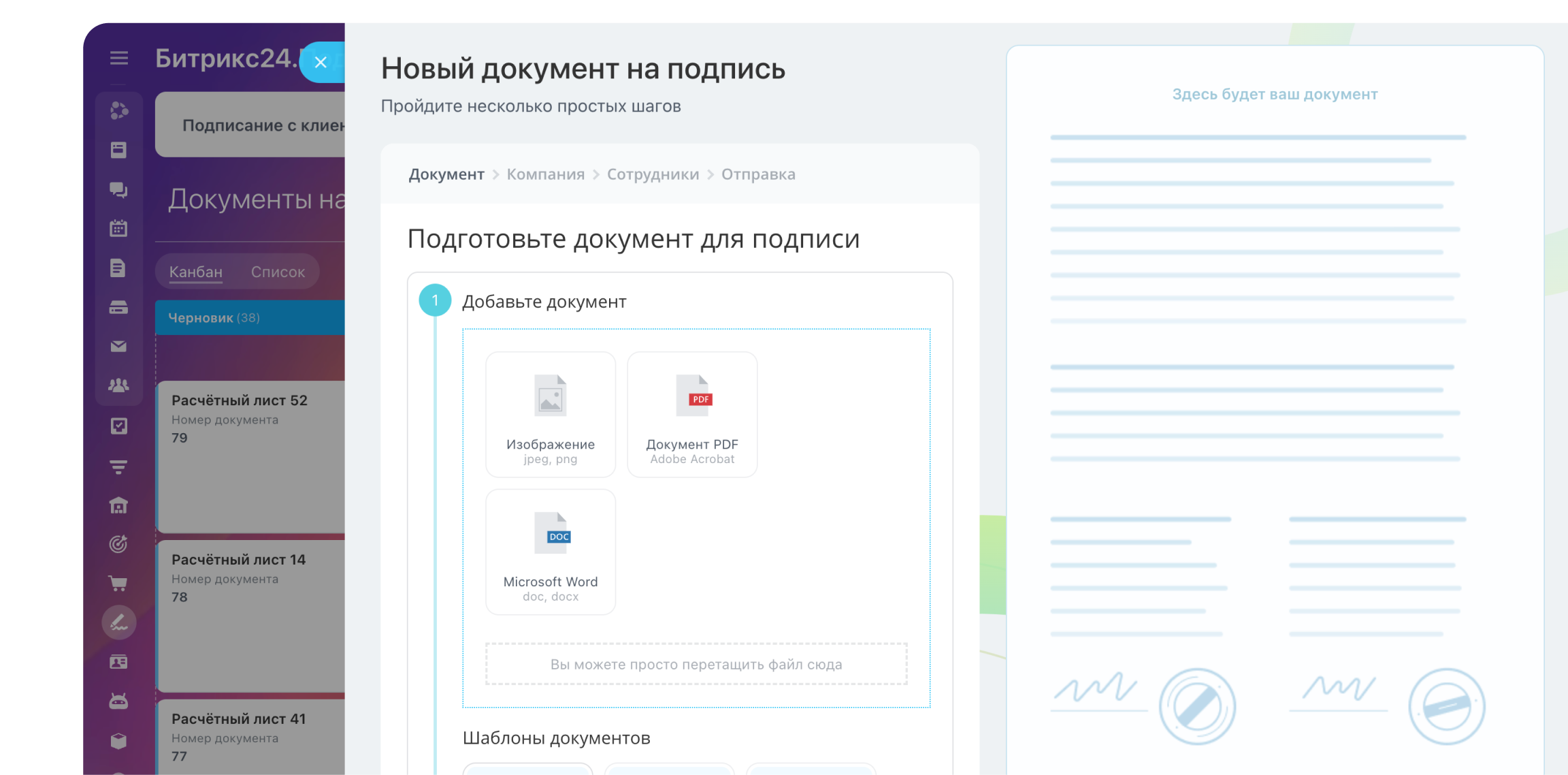 Не нужно регистрировать всех в отдельном сервисе для документов. Битрикс24 — это полноценное рабочее место, где есть все необходимое.